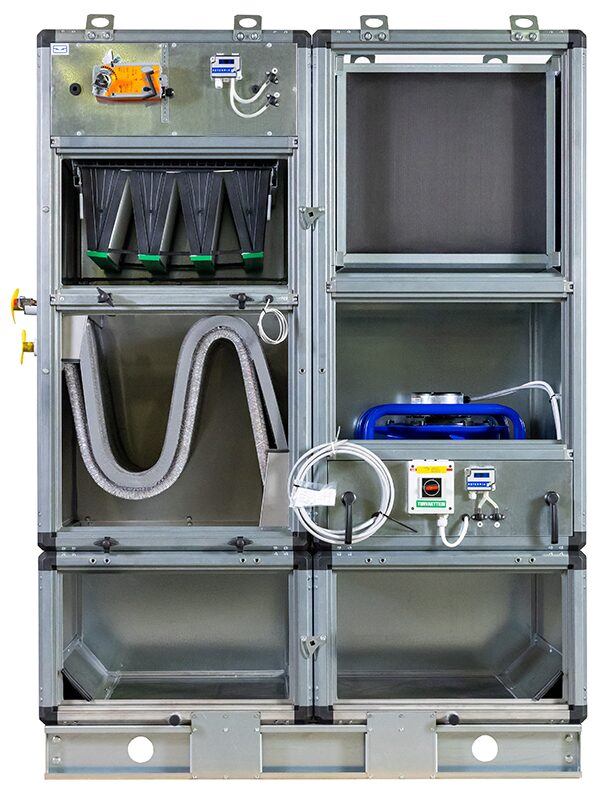 Suodatinta ennen sijaitsevat neulalämmönsiirtimet toimivat myös G3-tason esisuodattimina. Toisessa pystyosassa ovat puhallin- ja äänenvaimennustoiminnot. Konejalustalla varustetussa pohjaosassa on pesuvesiallas ja viemäröintiyhde. Pohjaosassa tuloilma siirtyy pystyosasta toiseen.
