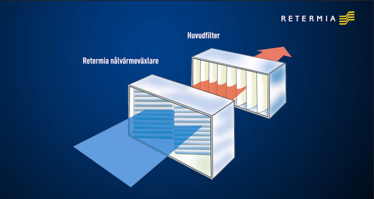 Retermias nålvärmeväxlare fungerar som ett grovfilter för tilluften. Nålvärmeväxlaren (I) förhindrar därmed intrång av snö och andra stora partiklar i luftkanalerna. Ren tilluft och torra filter (III) ger hög kvalitet på inomhusluften.