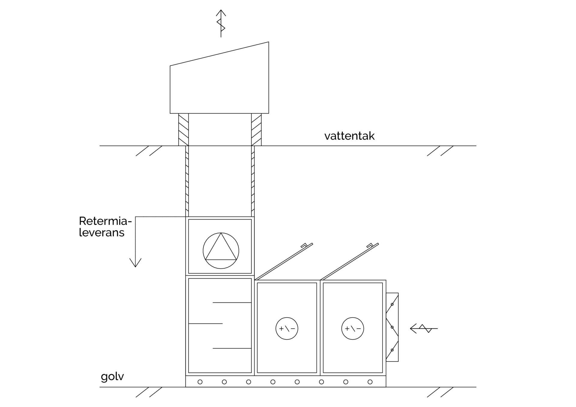 RETCARE IN E -frånluftsaggregat finns i flera olika storlekar. Aggregatets totala mått bestäms av det tillgängliga utrymmet, den valda aggregatstorleken och antalet funktionsdelar. Ett aggregat som är dimensionerat för ett luftflöde på 500-2000 l/s kan installeras i ett utrymme med en bredd och höjd på ca 2 m och längd, beroende på VÅV-batteriets storlek, ca 2,5-3,5 m.