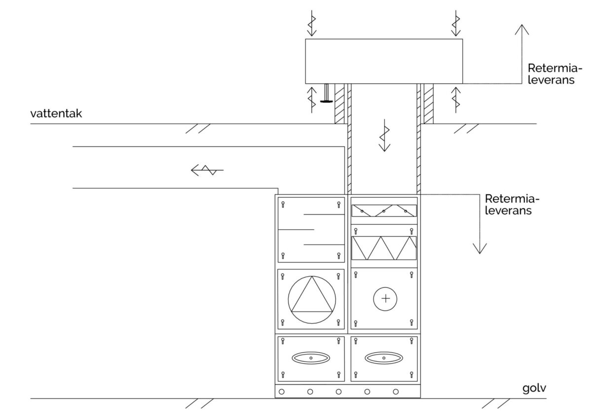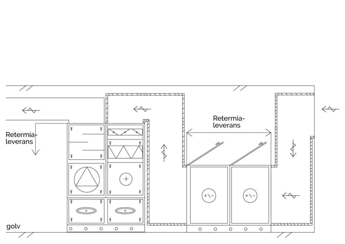 Installationsprincip för tilluftsaggregatet RETCARE IN S när VÅV implementeras med en Retermia Standard -nålvärmeväxlare i friskluftskanalen.