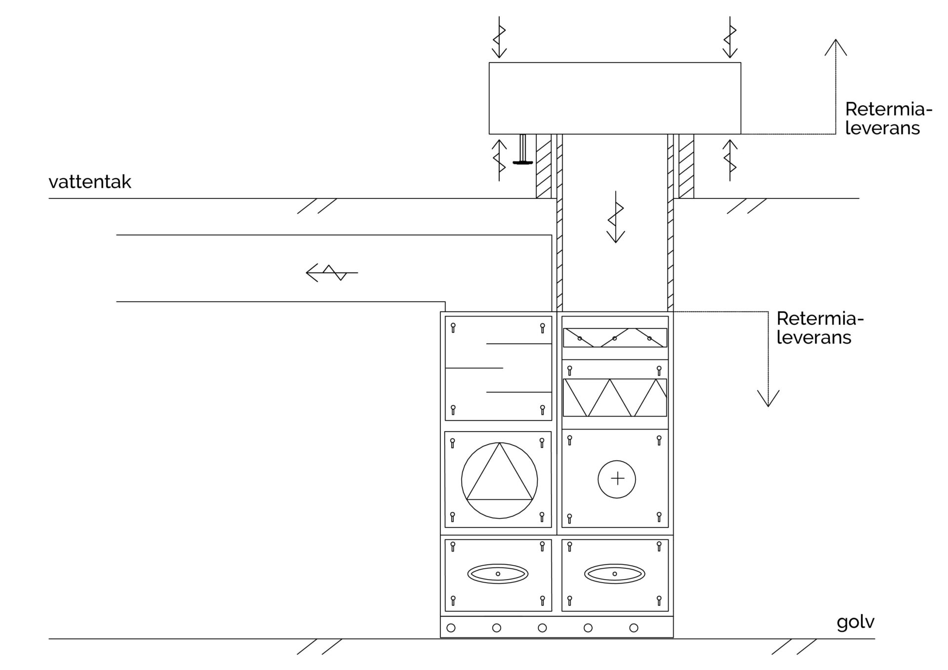en dräneringsanslutning. Tilluften strömmar från en vertikal del till en annan i bottendelen.