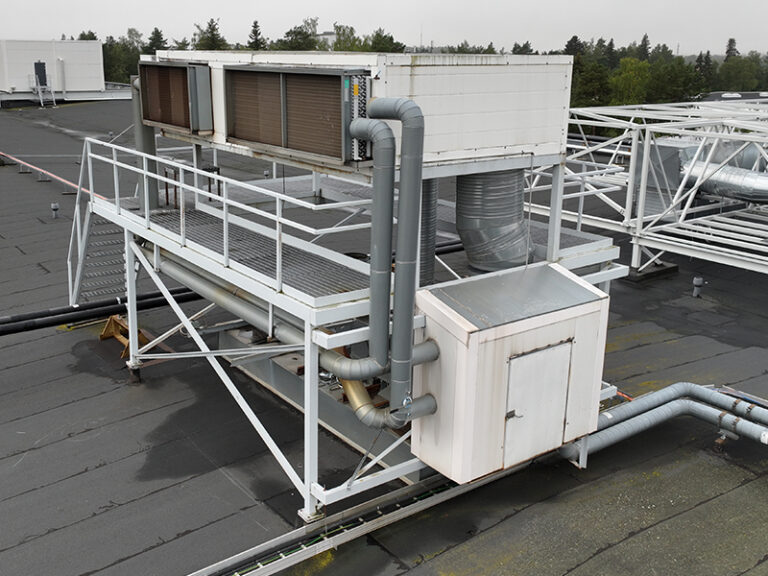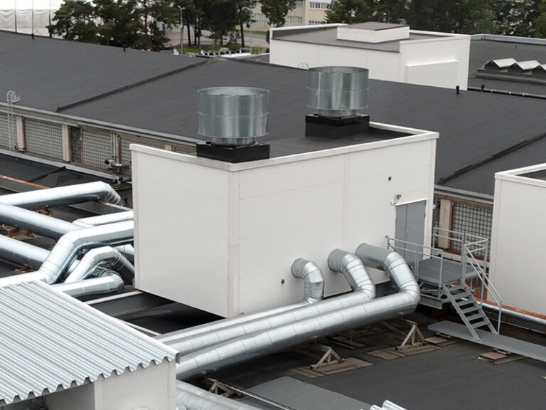 Uudet puhaltimet ja LTO-poistopatterit sijaitsevat vesikatolle rakennetussa