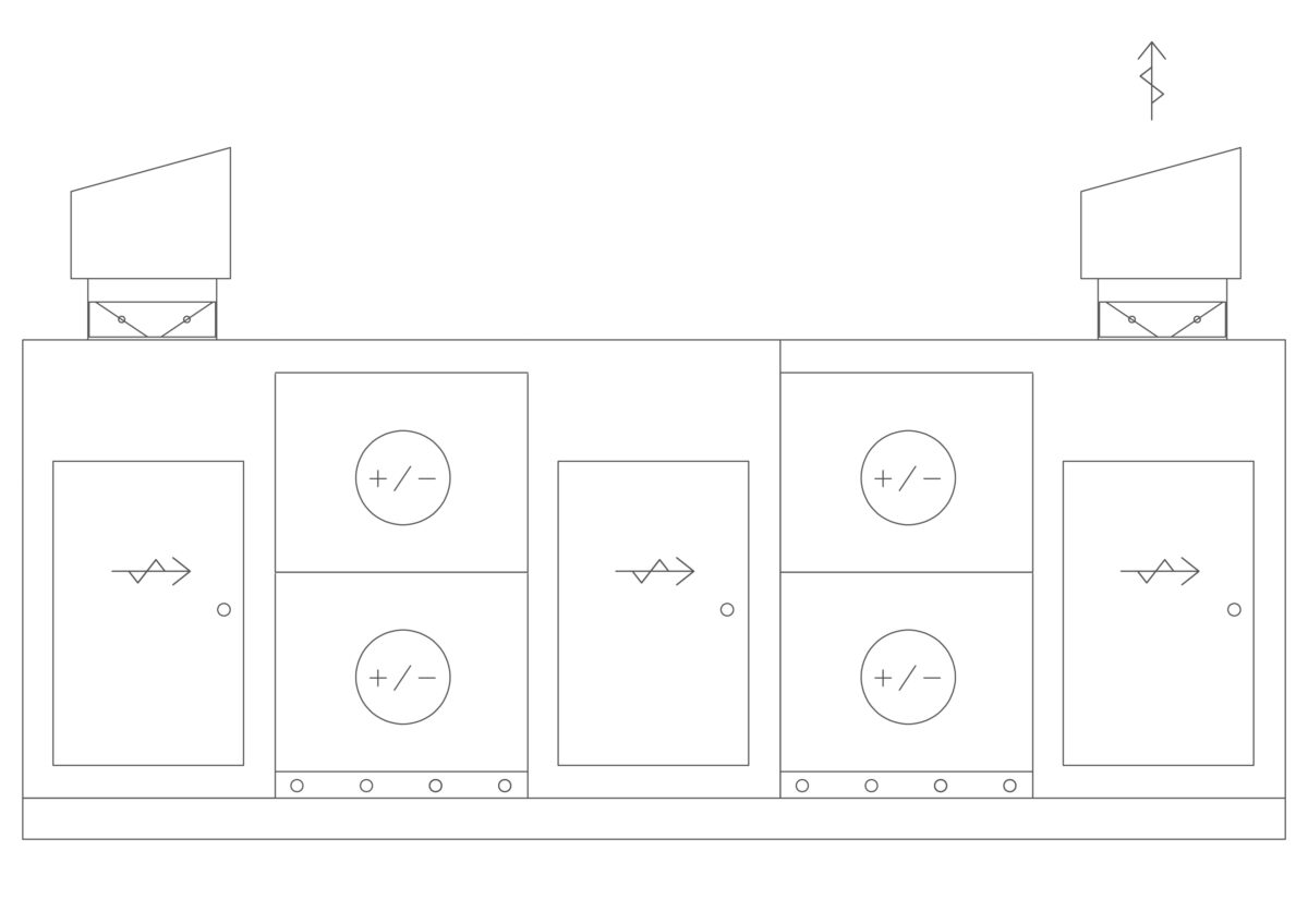 Vesikatolle rakennetiin ilmanvaihtokonehuone, jonne sijoitettiin uudet puhaltimet ja LTO-poistopatterit. Retermia LTO-poistopatteriseinät ja huoltokammiot ovat puhaltimien painepuolella.